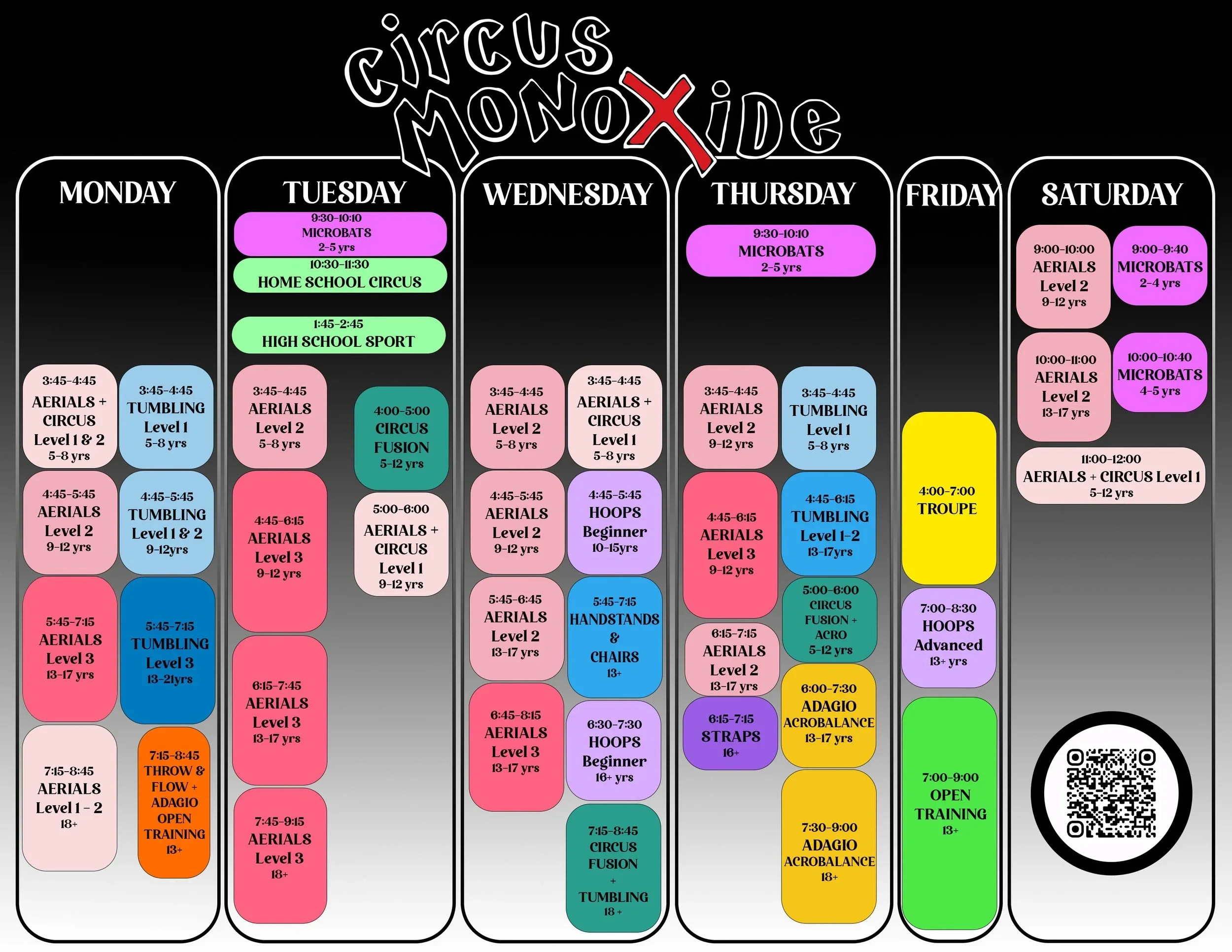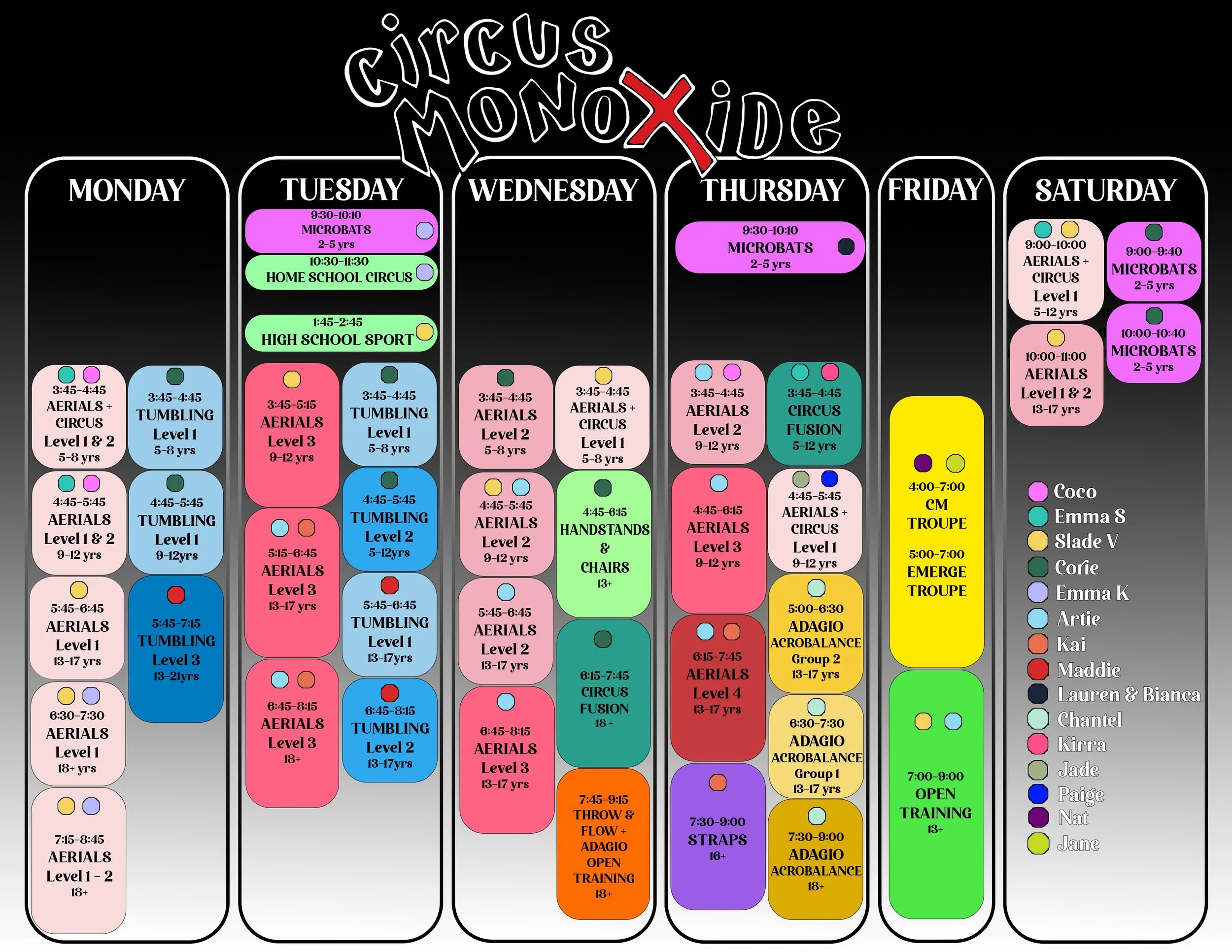 Looked at our timetable and are ready to join the fun? Secure your spot in one of our classes today and be part of the Circus Monoxide community!